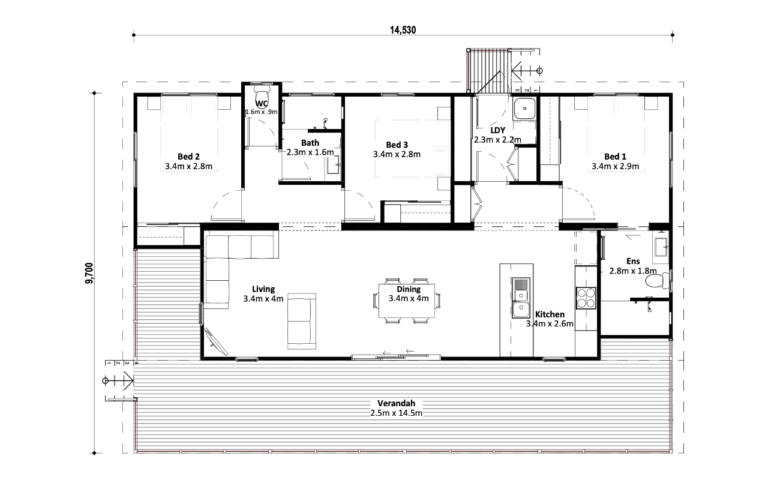 Cornwall orients living, kitchen and dining toward an expansive verandah – perfect for entertaining and making the most of rural outlooks.