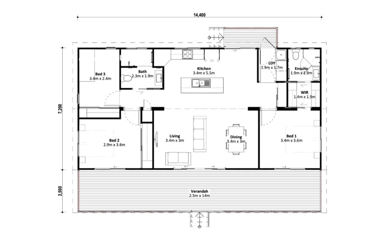 Windsor runs living, dining and kitchen through the centre of the home for airy flow from front verandah to the rear.
