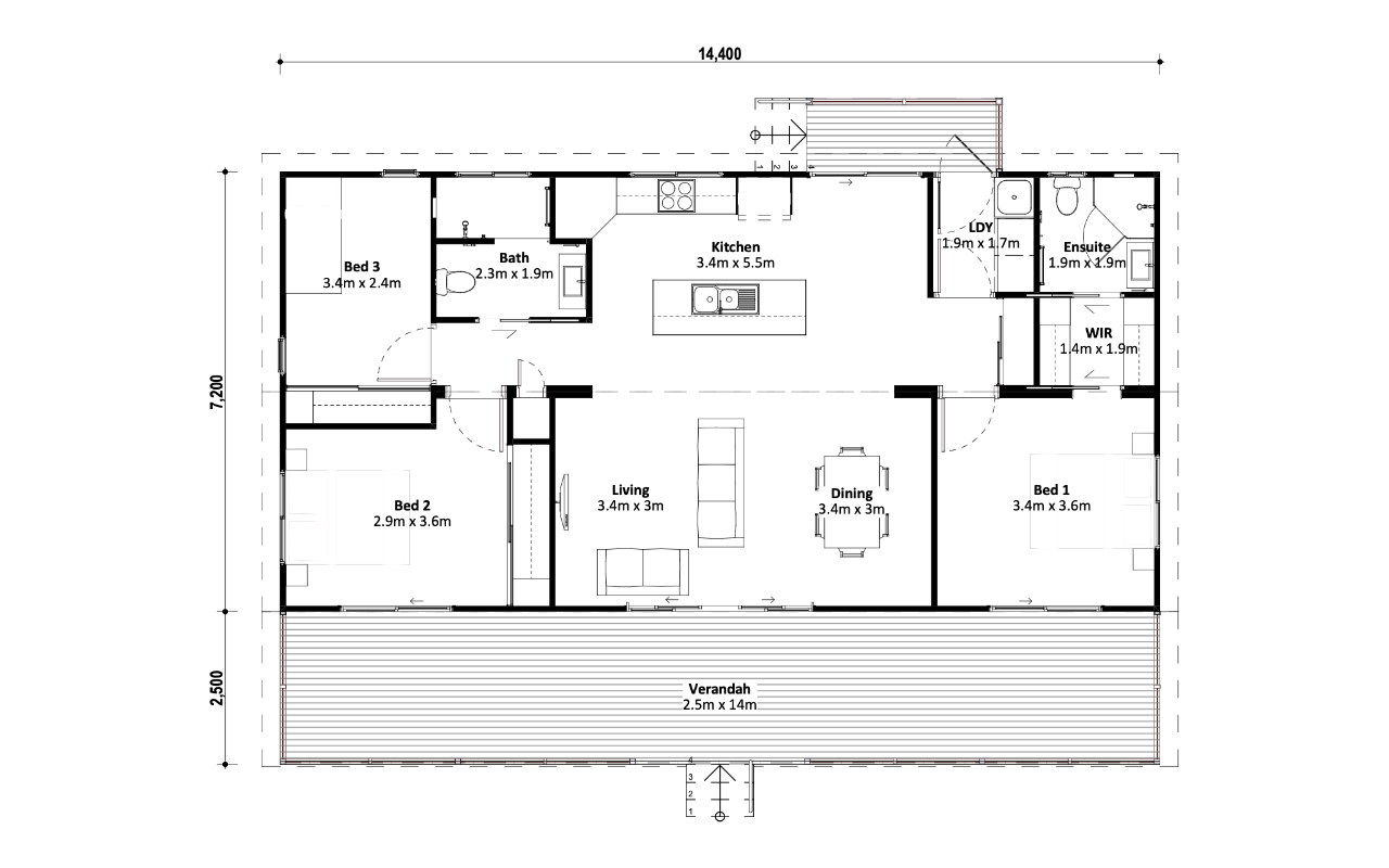 The master suite includes a walk-in robe and ensuite, with sliding doors from both the master and Bedroom 2 to the verandah for easy outdoor access.